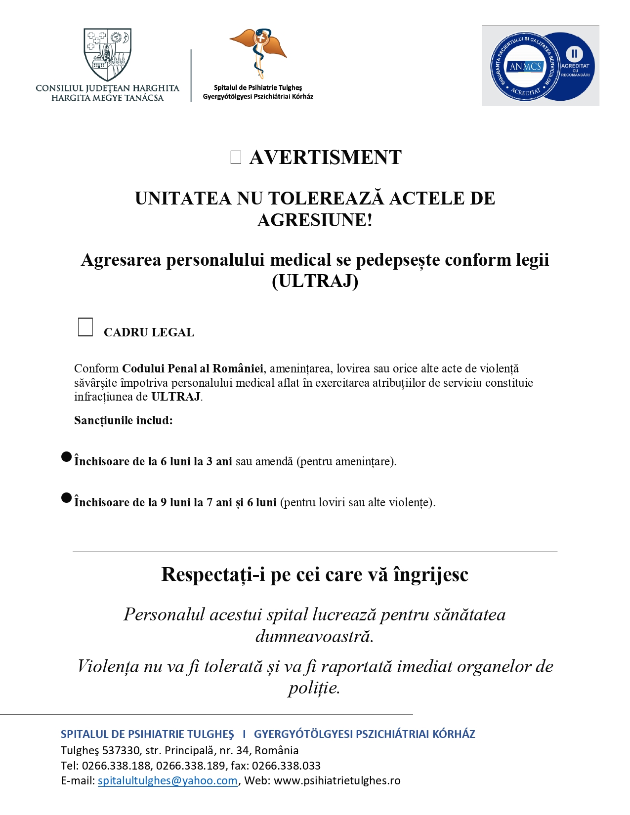 Obligaţiile pacienţiilor: să însuşească şi să respecte Regulamentul de ordine interioara a Spitalului, conform legilor in vigoare.